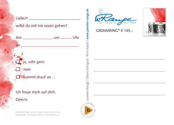 Während die anderen Karten der Serie eine zwar gestaltete, aber leere Fläche auf der Rückseite haben, die Platz zum Beschreiben lässt, bietet diese Karte vor allem Schreibfaulen *gg Gelegenheit, eine Einladung zum Essen auszusprechen.