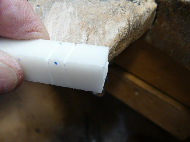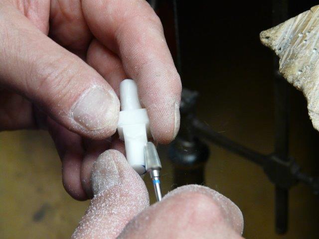 Im Falle unseres Isolators ist das ein hochwertiger Kunststoff aus dem Großküchenbereich. Diesen Ersatzwerkstoff kann man genau so gut fräsen, bohren, feilen, genauso schön bearbeiten wie Elfenbein und er sieht Elfenbein auch zum Verwechseln ähnlich.