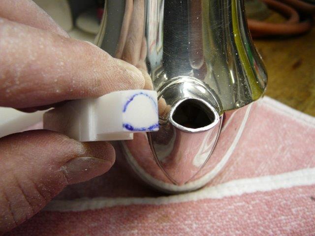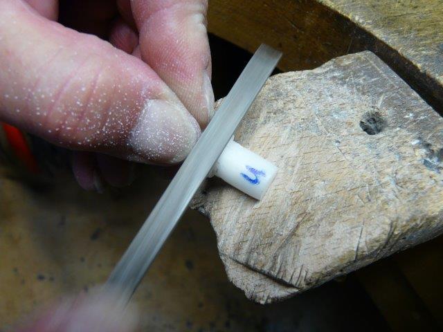 Der sichtbare Teil des Isolators, der gleichzeitig eine Wärmebarriere ist, wird noch manuell auf seine endgültige, halbrunde Form gefeilt und die sichtbaren Teile werden poliert.