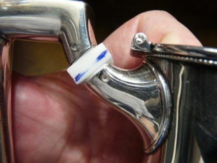 Das hohle Rohr des Kannengriffs endet in einem Zapfen auf dem das Isolierteil wie ein wulstiger Reifen sitzt. Erst nach dem Isolator beginnt der eigentliche Griff der Kanne. Ein solcher Isolator ist eine ebenso sinnvolle Ergänzung wie auch typische Sollbruchstelle. Früher machte man solche Isolatoren aus Elfenbein.