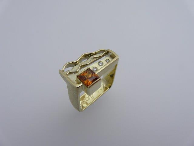 Und so entschieden wir uns hier – passend zum quadratischen Schmuckstein – aus dem ehemals runden Ring eine ebenfalls quadratische Ringschiene zu formen. Der außergewöhnliche Ringkopf erhielt eine assymetrische Form, was dem Quadratischen auflockernd entgegegenwirkt. Drei Wellenlinien symbolisieren das Wasser – oder anders gesagt – den Fluss des Lebens. Der Citrin gibt dem Ring seine Ausdrucksstärke, drei kleine Brillanten sorgen für Eleganz. Aus Harmoniegründen haben wir sie nicht streng in einer Reihe gefasst, sondern sie leicht gebogen der Wellenlinien angepasst.