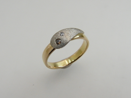 Für Letzteres sorgten wir, indem wir eine Platte aus Weißgold in Tränenform auf den Ehering des verstorbenen Mannes löteten. Die weißgoldene Träne erhielt ihren besonderen Charakter vor allem durch die aufgeraute Eisstrukturoberfläche, die mit der hochglänzenden gelbgoldenen Ringschiene kontrastierte. Das Topping bildeten zwei Brillanten unterschiedlicher Größe, von denen einer in Weiß erschien, während der zweite, größere Brillant Cognacfarben war.