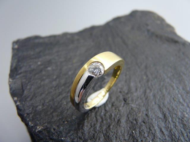 In einem anderen Fall brachte uns eine Kundin ein älteres Erbstück mit einem großen Brillanten. Dieser Ring in einer Bi-Colorschiene aus Gelb-Weißgold ist ein weiteres Beispiel, was aus Omas Solitärstein werden kann. Der neu entstandene Ring ist ein durchaus alltagstaugliches Modell. Dies vor allem deshalb, weil wir bei der Ringschiene darauf geachtet habe, dass sie sich dauerhaft komfortabel tragen lässt.