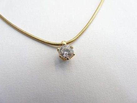 Ja, manchmal ist Schmuck zwar besonders zierlich, aber gleichzeitig auch besonders aussagekräftig. So wie dieser Einkaräter in einer winzigen, unscheinbaren Fassung an seiner goldenen Kette. Die Fassung des Anhängers ist kaum wahrnehmbar. Es ist ein Einkaräter in absolut bewusst unscheinbarer Fassung, die möglichst viel von der Schönheit des Einkaräters sichtbar machen soll.