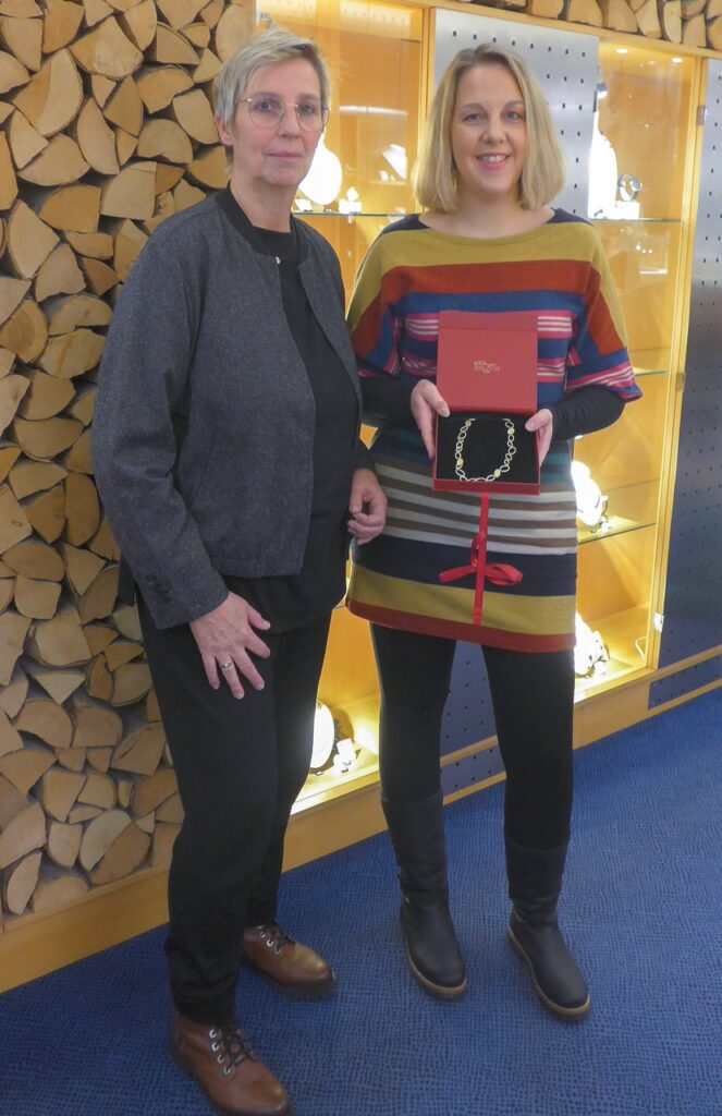 Nun gratulieren wir herzlich unserer glücklichen Gewinnerin, Frau Feldner. Sie hat sich für eine wunderschöne Kette aus vergoldetem Silber entschieden. Dieses besondere Schmuckstück ist nun ein Teil ihrer Sammlung. Und bleibt ein Andenken an einen historischen Meilenstein.