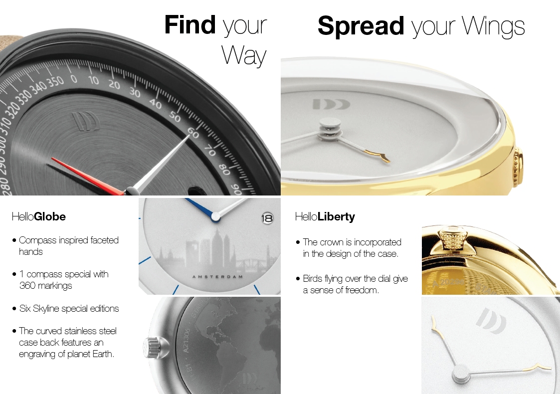 Eine Uhr, die in die Zeit passt! High-End-Design ohne überflüssige Elemente, konzentriert auf das Wesentliche, stabil und wertig verarbeitet, dabei erschwinglich, in vielen Farben und vier verschiedenen Formen. Jede Serie hat dabei eine eigene Geschichte und Botschaft, sie heißen HelloBalance (harmonisch ausbalanciert, siehe Bilder), HelloSun (rund, minimalistisch), HelloGlobe (Kompass-inspiriert, mit urbanen Skylines), HelloLiberty (mit goldener Krone).