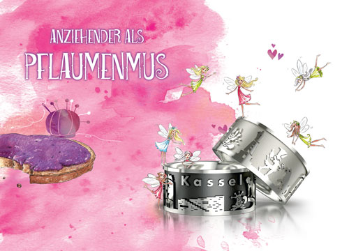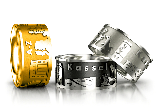 Nachdem unser kasselherz so großen Zuspruch in der Bevölkerung gefunden hatte, hatten wir die Idee, auch zur Eröffnung der GRIMMWELT ein Erinnerungsschmuckstück zu entwickeln. Entstanden ist ein Ring, der mehrere Themen harmonisch miteinander verbindet. Umlaufend werden abwechselnde Symboliken gezeigt: Märchenmotive, Wahrzeichen unserer Stadt, Ansichten der GRIMMWELT oder historische Erinnerungen an die Brüder Grimm.