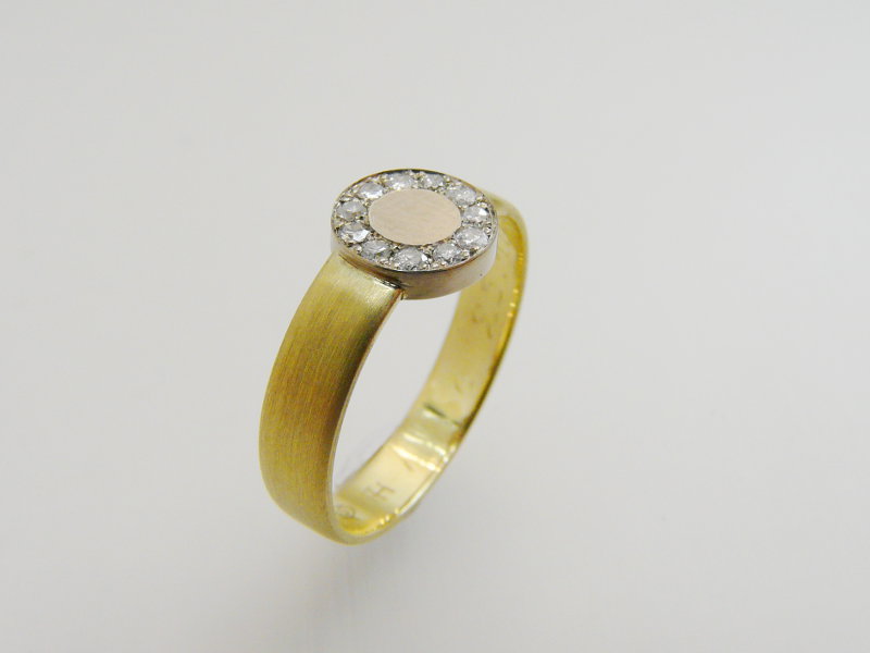 Eine Kundin kam mit einem über die Jahre zu eng gewordenen Ehering zu uns. Damit er wieder passte, musste er um einige Nummern geweitet werden. Man hätte also ein gehöriges Stück Gelbgold in die Schiene einsetzen müssen, um die richtige Passform